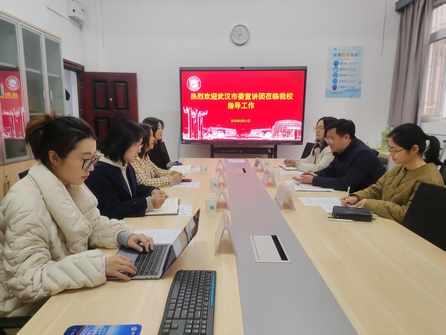 为深入贯彻落实党的二十大精神及党的二十届二中、三中全会精神,推动党的创新理论“飞入寻常百姓家”,3月11日下午,武汉市委讲师团主任李想、副主任陶文玲、理论辅导科专员李馨瑶一行3人来我校调研“武汉市理论热点面对面实践基地”建设情况,共商实践基地建设深化路径。学校宣传部、太阳集团tyc33455相关负责人陪同调研,并进行了深入的座谈交流。校党委宣传部常务副部长、新闻中心主任刘戈主持座谈会。