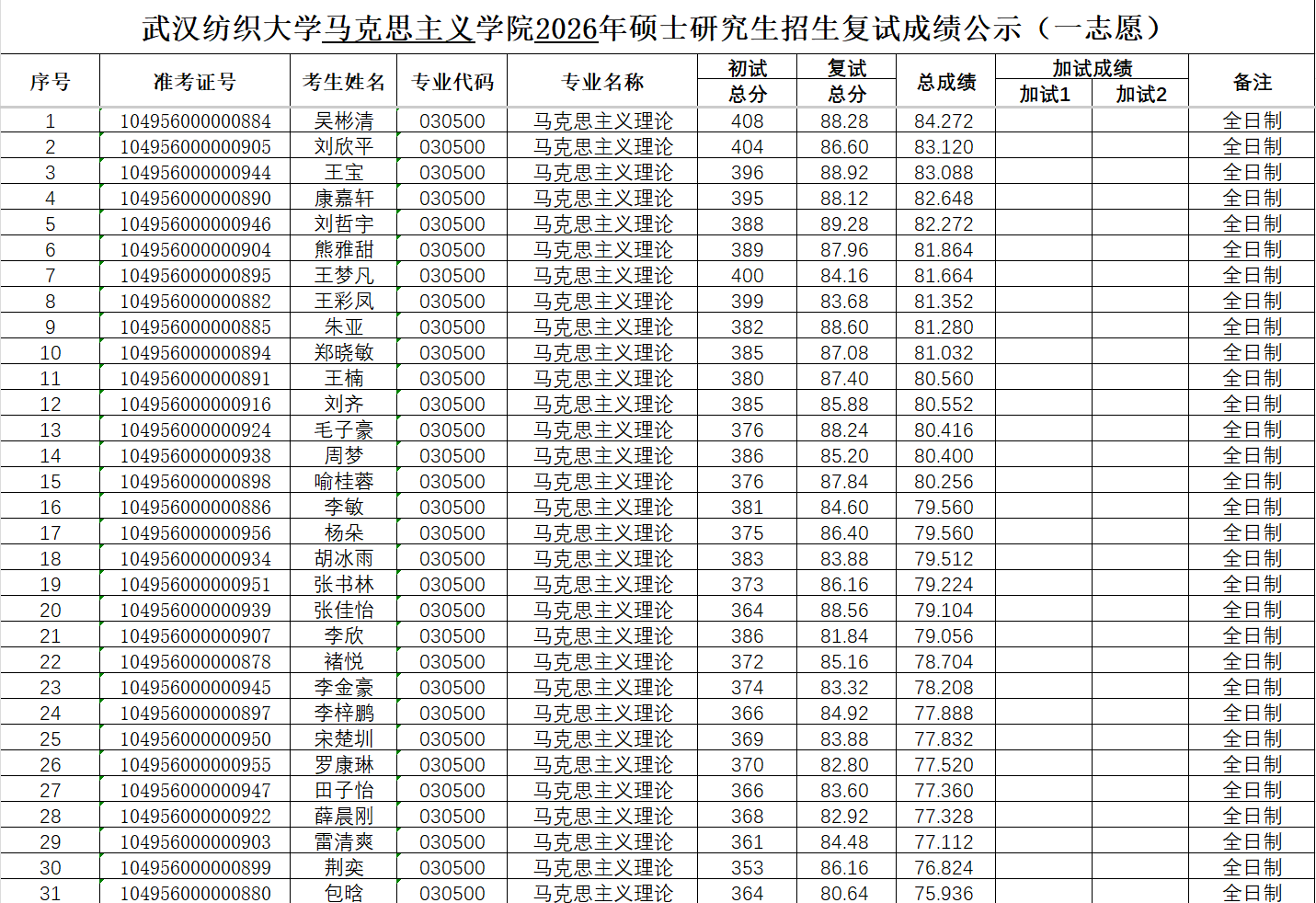 太阳集团tyc334552026年硕士研究生招生复试成绩公示(第一志愿)