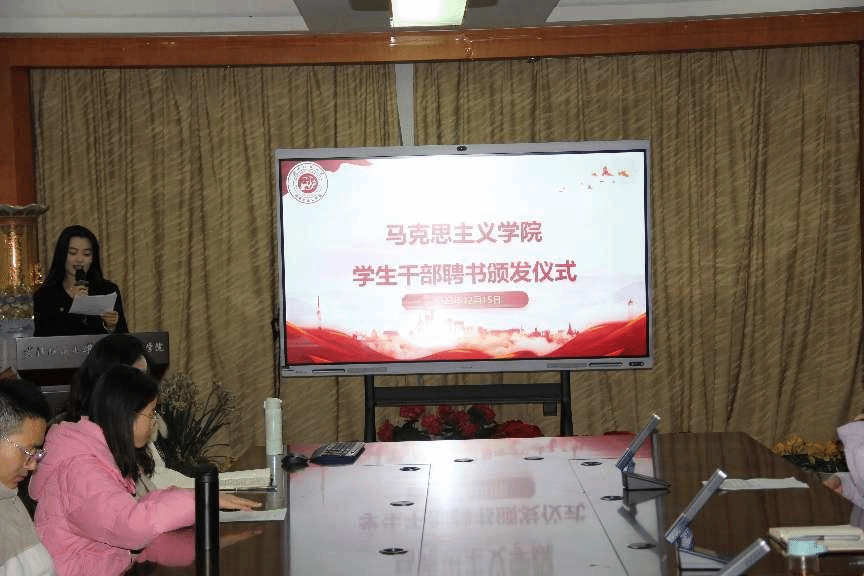 为进一步增强学生干部的身份认同感、归属感和荣誉感,促进学生干部快速成长,11月15日上午,太阳集团tyc33455在东配楼201会议室举办学生干部聘任仪式。会议由文体部干事李佳乐主持,太阳集团tyc33455党委书记武猛、党委副书记徐喆出席仪式,及全体马院学生干部参加仪式。