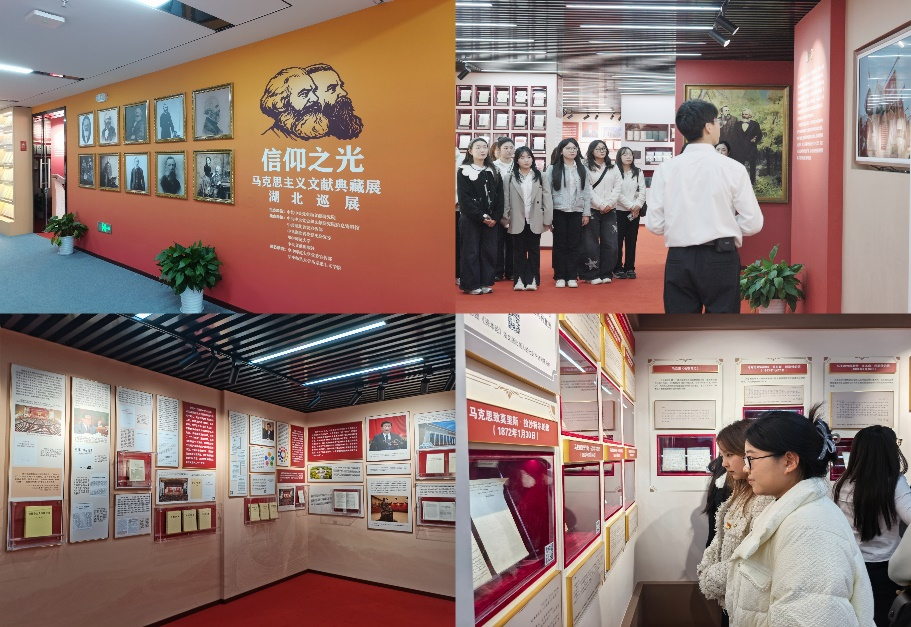 交流研讨结束后,在华师马院党员代表的引导下,武纺马院全体党员前往“信仰之光——马克思主义文献典藏展”进行参观。本次展览以“‘两个结合’:最大法宝”为核心主题,全面呈现出中国共产党成立100多年来推进马克思主义文献收集、翻译、研究、宣传的奋斗历程和伟大成就。展览分为“真理力量 薪火相传”“手稿藏书 经久弥珍”“经典巨著 思想丰碑”“‘两个结合’:最大法宝”四个篇章,共陈列400余件经典文献。其中不乏众多首次公开的马克思恩格斯原始手稿等珍贵文献,让党员们近距离感受真理的温度。展览通过实体文献展示、译文深度解读、历史图片配套、互动屏幕沉浸式体验等多元形式,实现理论性与故事性、专业性与知识性的有机统一,具有极高的文献价值和历史意义,是面向高校师生开展马克思主义理论教育和理想信念教育的生动课堂。