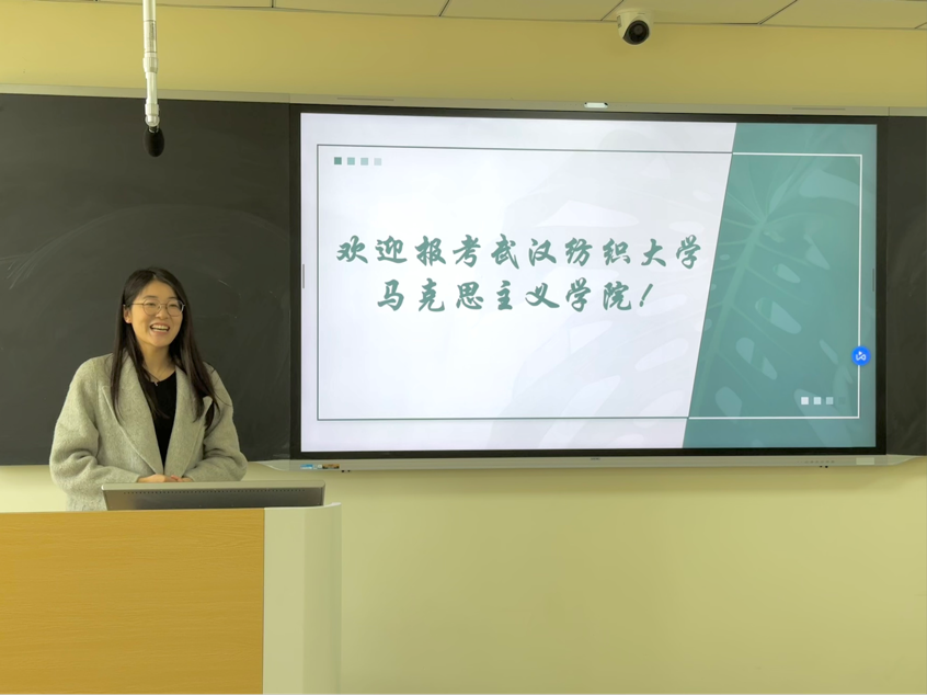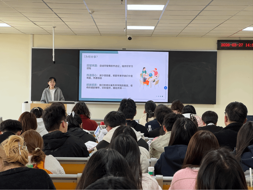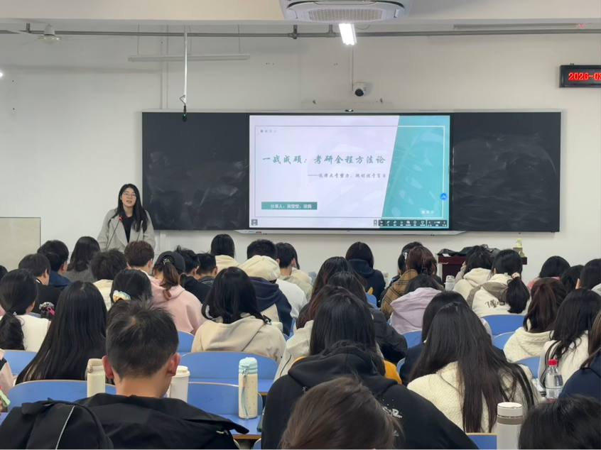 宣讲会上,黄莹莹围绕“如何做出正确的选择”这个主题,结合自身备考经历,为在场同学提供了清晰的考研选择思路引导;梁爽则从公共课与专业课的备考策略入手,分享了具体的复习方法和经验心得。两位同学的分享内容详实、贴近实际,现场气氛热烈,互动频繁。