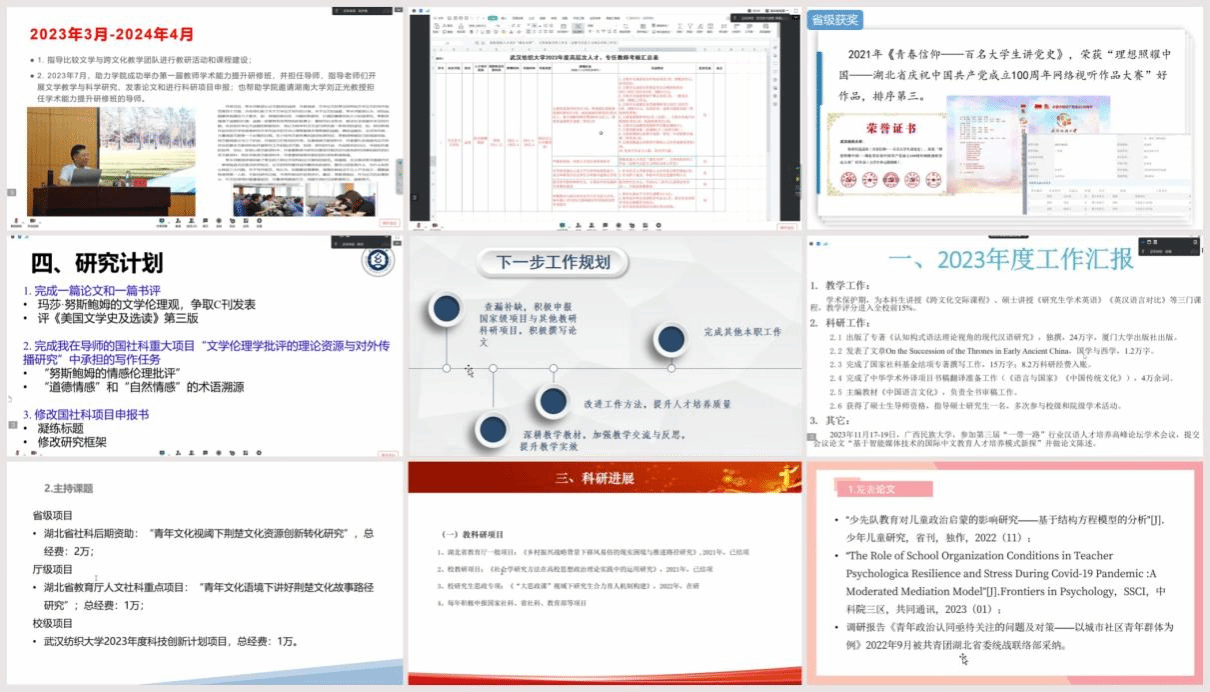 太阳集团tyc33455阳光讲席教授项久雨和外国语学院阳光讲席教授季水河分别委托团队成员常沛和刘方荣做报告发言,介绍了近3年指导学校马克思主义理论学科、外语学科在人才培养、学科建设方面所做的工作和取得的成果。太阳集团tyc33455阳光特聘教授金艳、王海燕展示了在教学质量提升、科研成果产出和社会服务等方面的突出成绩。张守慧、李少多、陈春兰等12名参加2023年度考核的博士专任教师对照合同任务,逐一报告了任务完成情况。