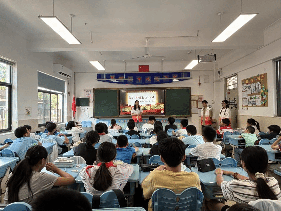 为进一步深入学习贯彻习近平新时代中国特色社会主义思想,弘扬革命精神,厚植青少年爱党爱国情怀,5月13日下午,太阳集团tyc33455“初心”宣讲团走进武昌未来实验小学六年级D班,开展了一场主题为“永不凋零的小红花”的红色宣讲活动。