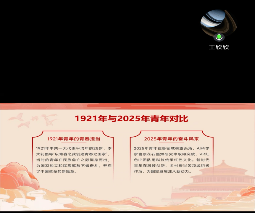 团课最后,王欣欣以 “从红船到星海,精神之火永不灭;从理想到行动,青春之我永向前” 总结,号召全体团员以青春之我筑强国之梦,用实际行动传承建党精神,在民族复兴的征程中书写青春华章。团员们在线上积极互动,纷纷表示通过学习,对建党精神有了更深刻地理解,也更加明确了自身肩负的使命。未来,大家将把所学所悟转化为实际行动,让青春在担当与奋斗中绽放光彩。