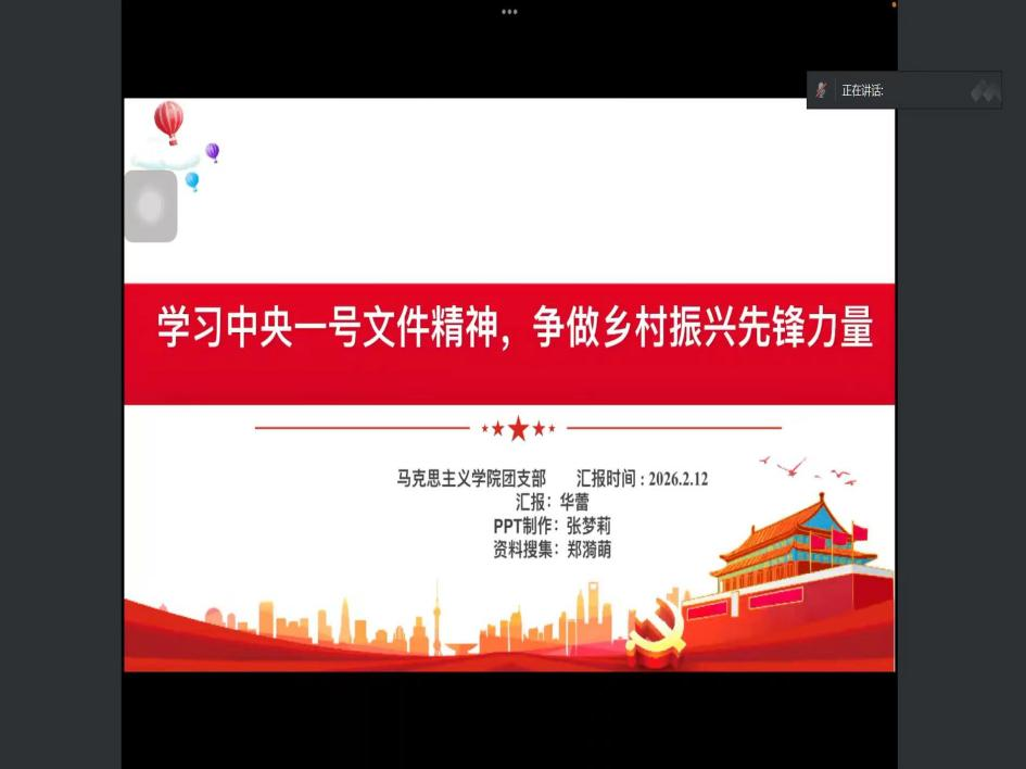 为深入学习贯彻2026年中央一号文件精神,引导青年学生深刻领会新时代农业农村现代化和乡村全面振兴的战略意义,2月12日,太阳集团tyc33455团支部开展“学习中央一号文件精神,争做乡村振兴先锋力量”主题团课。本次团课由华蕾同学主讲,郑漪萌、张梦莉等同学协作筹备,学院全体团员参加。