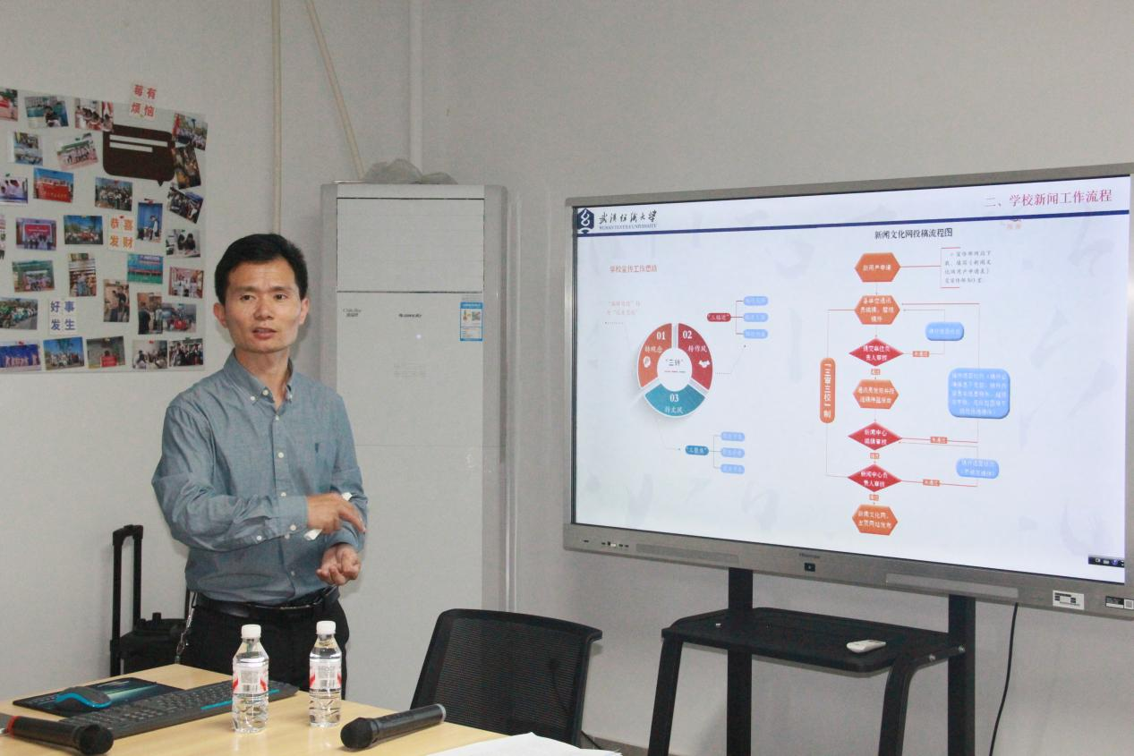 会上,程鹏主要围绕“新闻的操守与底线”“学校新闻工作流程”“纺大新闻管理办法解读与业务实操”“新闻练兵实践”四个环节展开讲解。首先,程鹏通过典型案例分析,深入浅出地阐释了新闻要遵守的基本底线,为本次培训的开展筑牢了思想根基。随后,程鹏简要介绍了学校新闻工作流程。在第三个环节中,他以纺大新闻管理办法的解读为依托,为大家重点讲述了一篇合格新闻的撰写规范和供稿流程,以及对“如何成为一名优秀培训员”问题提出了具体的建议。不仅如此,程鹏列举多类社会热点新闻,用反面教材为在场同学“敲响警钟”,强调了对待网络新闻应有的正确原则。最后,程鹏为同学们展示了学校部分新闻案例,并鼓励大家积极参与新闻撰写实践,努力提高新闻写作水平。